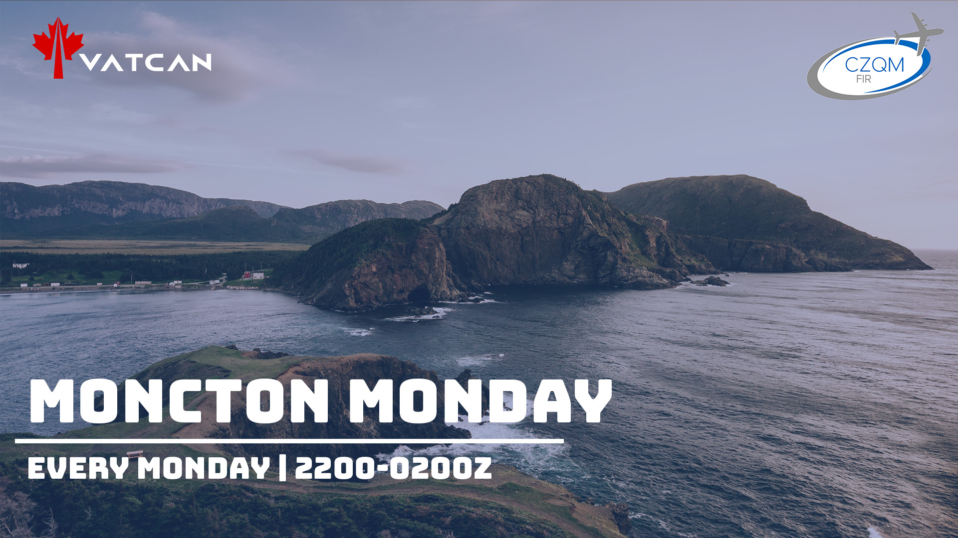 **Moncton Mondays** is VATNA's longest running weekly event! **CZQM/QX** provides full coverage ATC every Monday evening, beginning at 2300Z, encompassing over six terminal zones and dozens of smaller fields. Each Monday airports including Halifax Standfield International(**CYHZ**), Greater Moncton Roméo LeBlanc International(**CYQM**), St. John's International(**CYYT**), Gander International(**CYQX**), Fredericton International(**CYFC**), Goose Bay(**CYYR**), Charlottetown(**CYYG**) and Deer Lake Regional(**CYDF**) welcome in aircraft from all over the world, enjoying the famous Atlantic Canadian hospitality that we are known for. Pilots of all experience levels are encouraged to participate; IFR or VFR, fixed wing or rotary, we welcome you to our event.